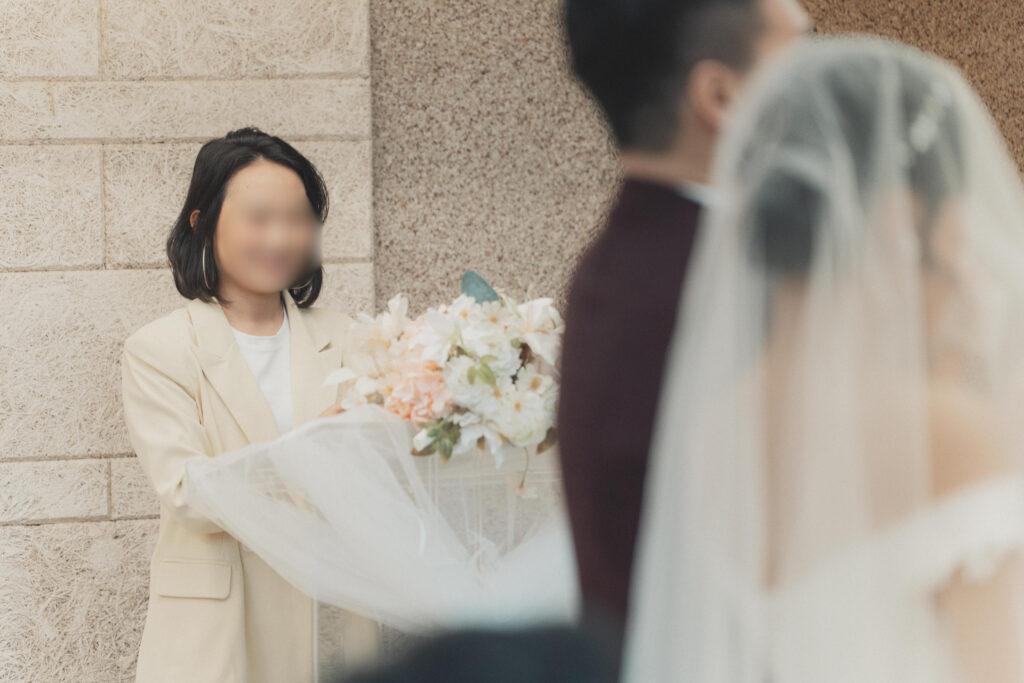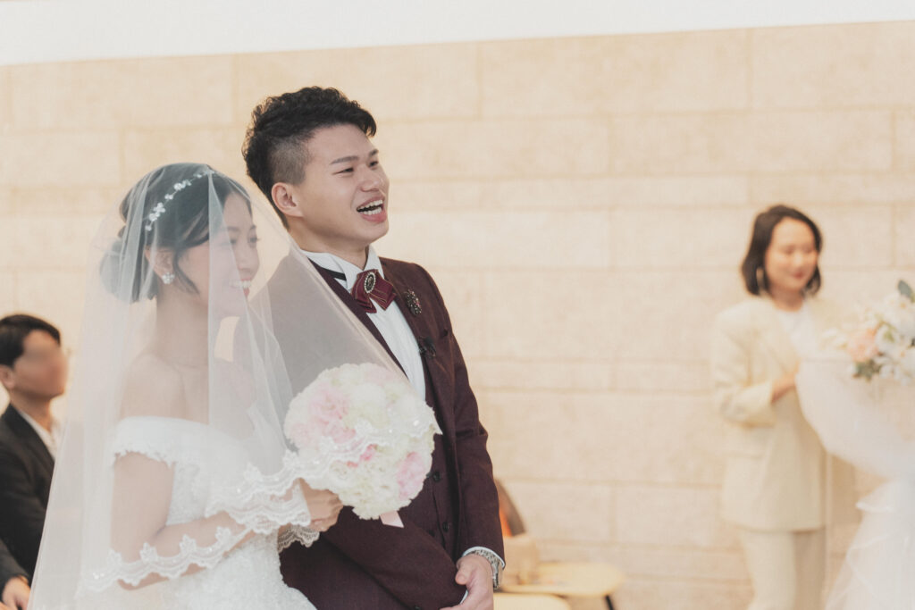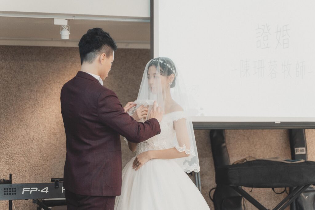 新郎還特地上網看影片學怎麼「正確揭紗」,要邊捲邊往上拉~不過老實說,紗真的是我那時最想趕快揭開的東西😂 因為它一直磨到我的臉、又讓我視線模糊。當紗被掀開的那一刻,世界突然變得清晰又明亮,真的好讚!