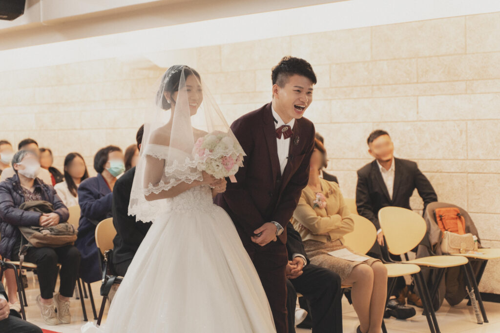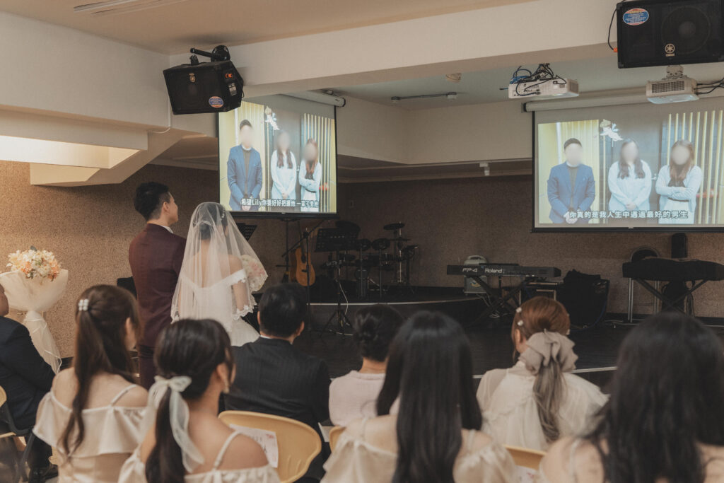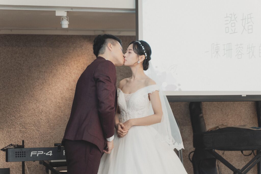 在我們教會舉行婚禮會「親兩次」,因為舞台有 A 面和 B 面,另一邊的賓客若沒看到就會起鬨:「看不到!這邊要再親一次!」🤣真的是又害羞又好笑~但我早就有心理準備,完全預備好要親兩次啦!