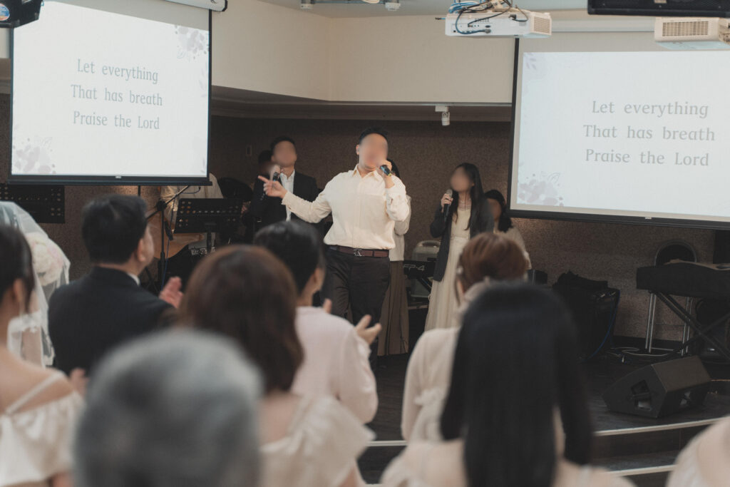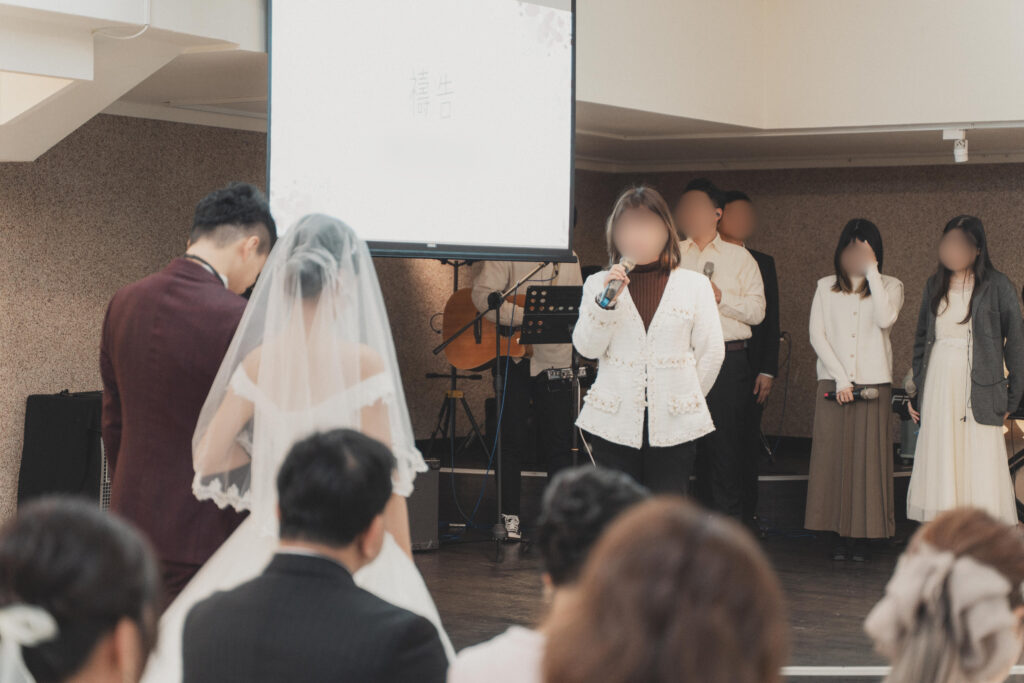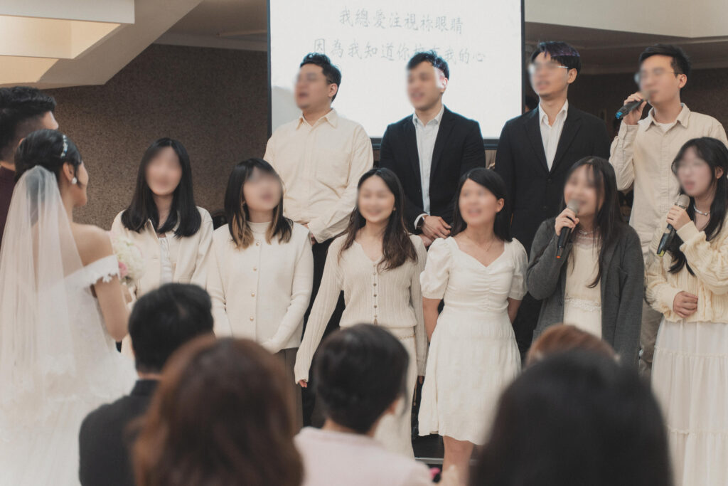 原來是教會的好友們偷偷安排的,由我們婚禮總召一手策劃,我當天根本不知道會是誰上台、也不知道他們要唱哪一首詩歌。