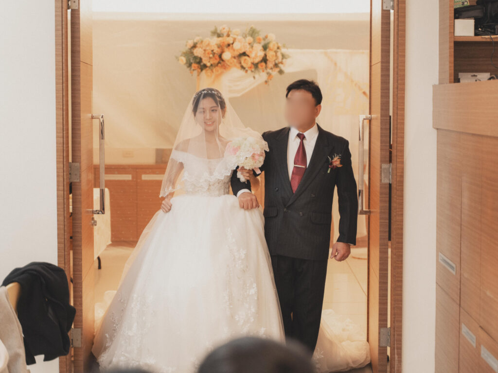 爸爸一步一步帶著我走向紅毯,紅毯的另一端站著我的媽媽和未婚夫,放眼望去都是我愛的家人朋友在看著我。門打開那一刻,除了有點緊張之外,滿滿地充滿感謝和溫暖的心情,覺得自己很被愛、被祝福。