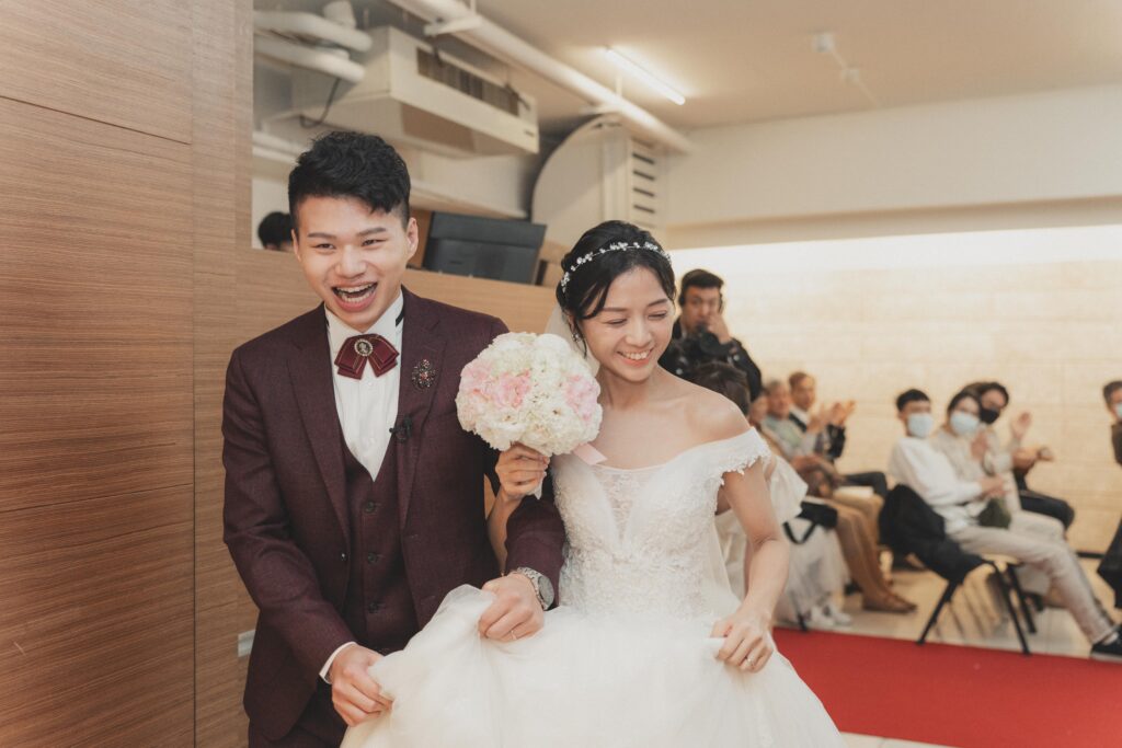 我的婚紗裙擺非常長,老公在旁邊扶著我,下樓梯的時候,伴娘在後面幫我拉裙襬。本來是想再買一件行動方便一點的證婚小裙子就好,但我媽那時候覺得就是要大裙擺、氣派一點,才有新娘子的樣子。我後來也覺得,果然是還好有聽媽媽的話,長拖尾婚紗雖然走起來比較不方便,但整個看起來,還有拍照的效果是我很喜歡的!很華麗、很典雅、很新娘子😆