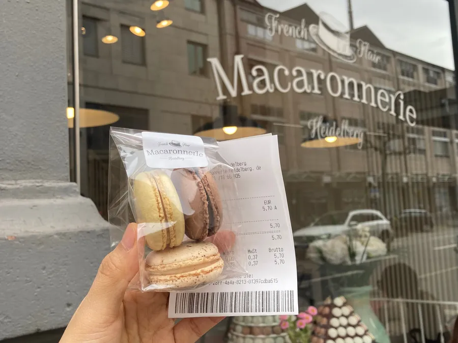 位於海德堡俾斯麥廣場附近的馬卡龍店,馬卡龍還是算是挺奢侈的點心,1.90歐/個 (2023年的物價)。我買了黑巧克力口味、香草口味、檸檬口味。檸檬口味是店員推薦給我的,但是我覺得太酸了,沒有很好吃XD 黑巧和香草都很讚,尤其是黑巧。