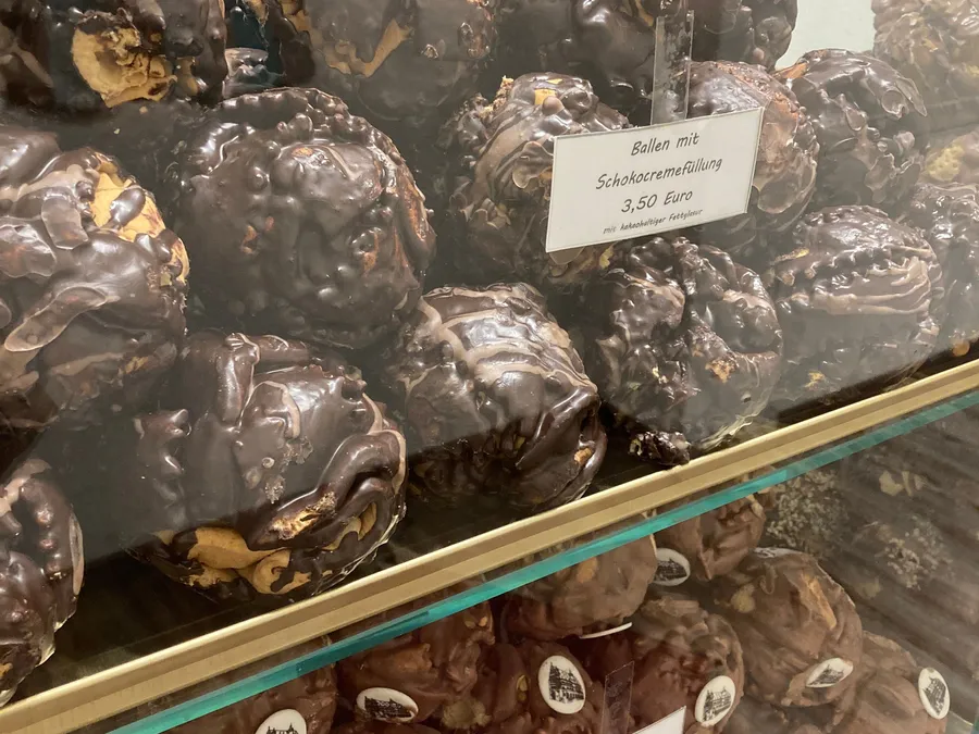 Schneeball 是用一條條像餅乾麵團的東西捏成球狀之後拿去油炸,咬起來是脆脆偏硬的口感,比較像餅乾的那種酥脆感,而不是甜甜圈那種鬆軟的口感。外層還會裹上很多不同的口味:像是巧克力、糖粉、肉桂、開心果、焦糖……口味很多。
