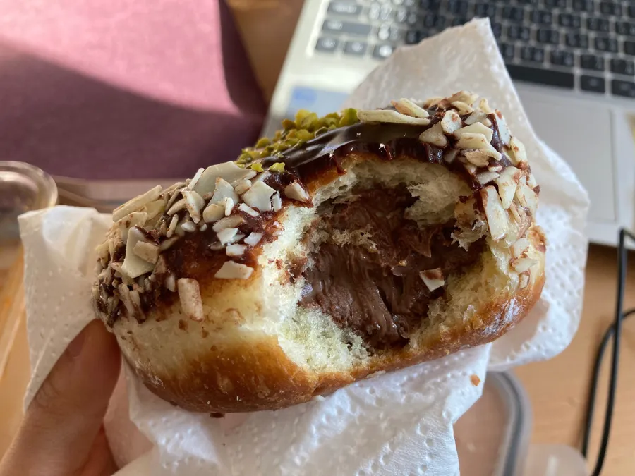 這是我第一次看到中間沒有洞的甜甜圈,看起來就超甜。實際吃起來,果然像它外表給人的一樣,極致甜XD 裡面內餡這樣的搭配是挺好吃的!如果搭配無糖茶的話,會很不錯!我個人覺得很好吃。