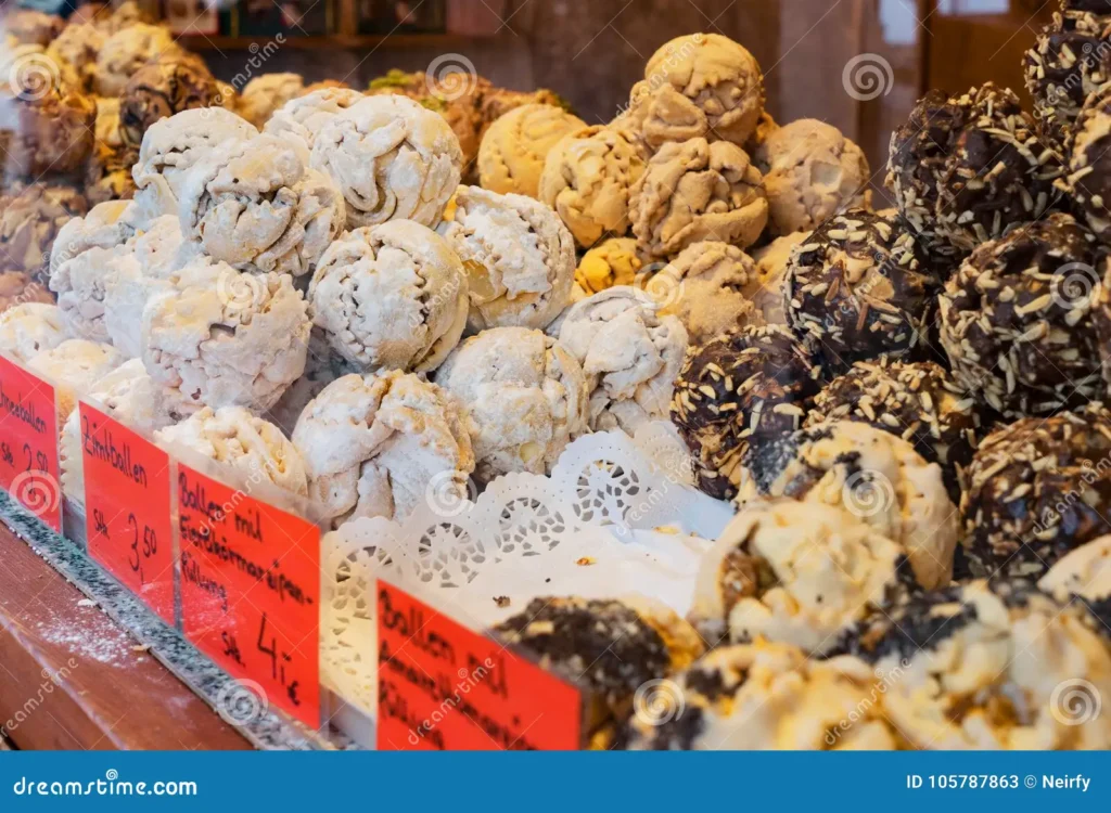 它的外型真的就像一顆圓滾滾的雪球,看起來可愛到不買不行,是巴伐利亞地區的傳統點心,尤其在羅滕堡(Rothenburg ob der Tauber)最有名,但在其他城市的觀光區有時也能看到。