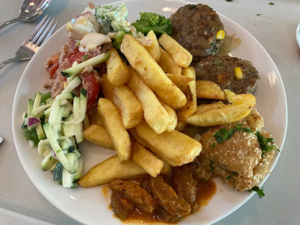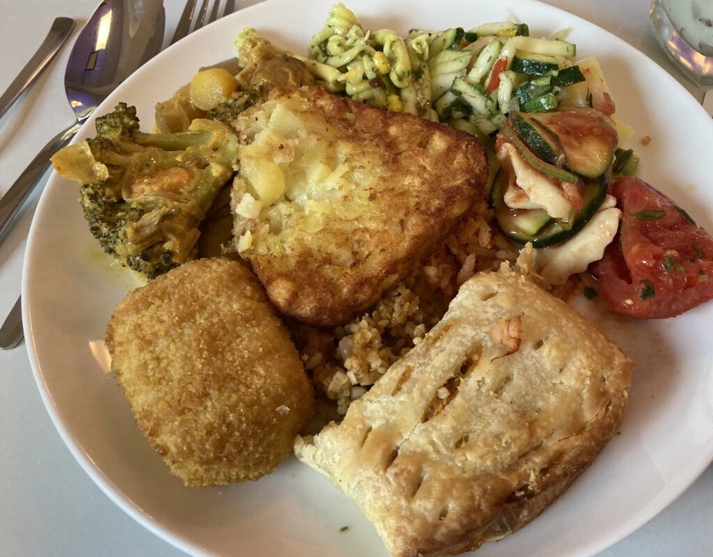 進門右手邊,會看到秤重式自助吧區(正餐類),裡面的菜色非常豐富多元,每天的料理都不一樣,基本上覺得都很不錯,只是德國菜真的偏鹹。