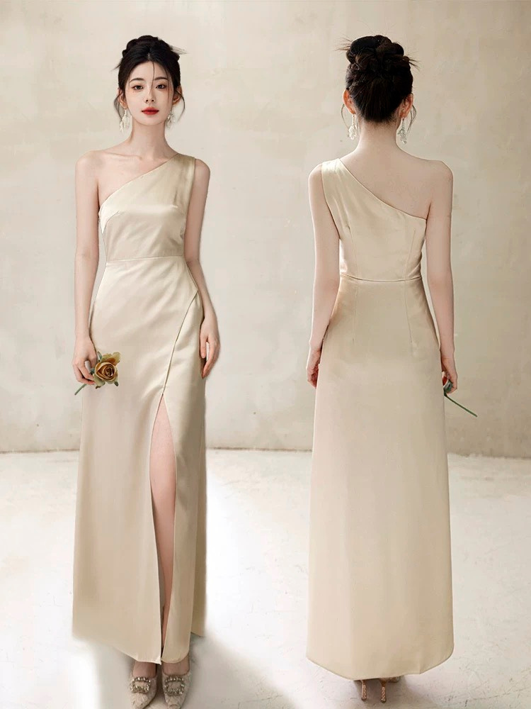 這家評論都很不錯,衣服的面料、質感真的是很讚的,也很顯白。我選的是👉 香槟色缎面伴娘服姐妹裙2025新款主持合唱活动表演宴会礼服长裙 這款四款我每一個都看過實體,其中三款「吊帶一字肩」、「性感掛脖」、「荷邊葉飄帶」我覺得都很好看,很美,實穿也都沒問題。