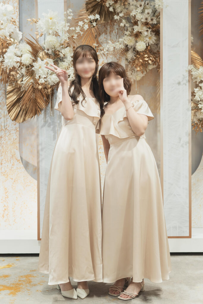 我的婚禮主題色是黃色系與香檳金,為了避免伴娘與背景顏色融在一起,我挑了奶杏、杏白色系的緞面禮服。