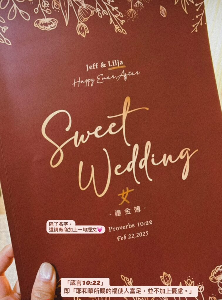 雖然原本設計只有名字能改,但我覺得如果有些小細節想更動,其實可以和店家溝通。像我就加上了一段我很喜歡的經文:Proverbs 10:22 —『耶和華所賜的福使人富足,並不加上憂慮。』 這不只是我的金錢觀,更代表我相信一切的產業與所有都在神的手中。對我來說,雖然禮金簿看似只是一本小本子,但它所記錄的都是至親好友的祝福,所以更值得好好保存。