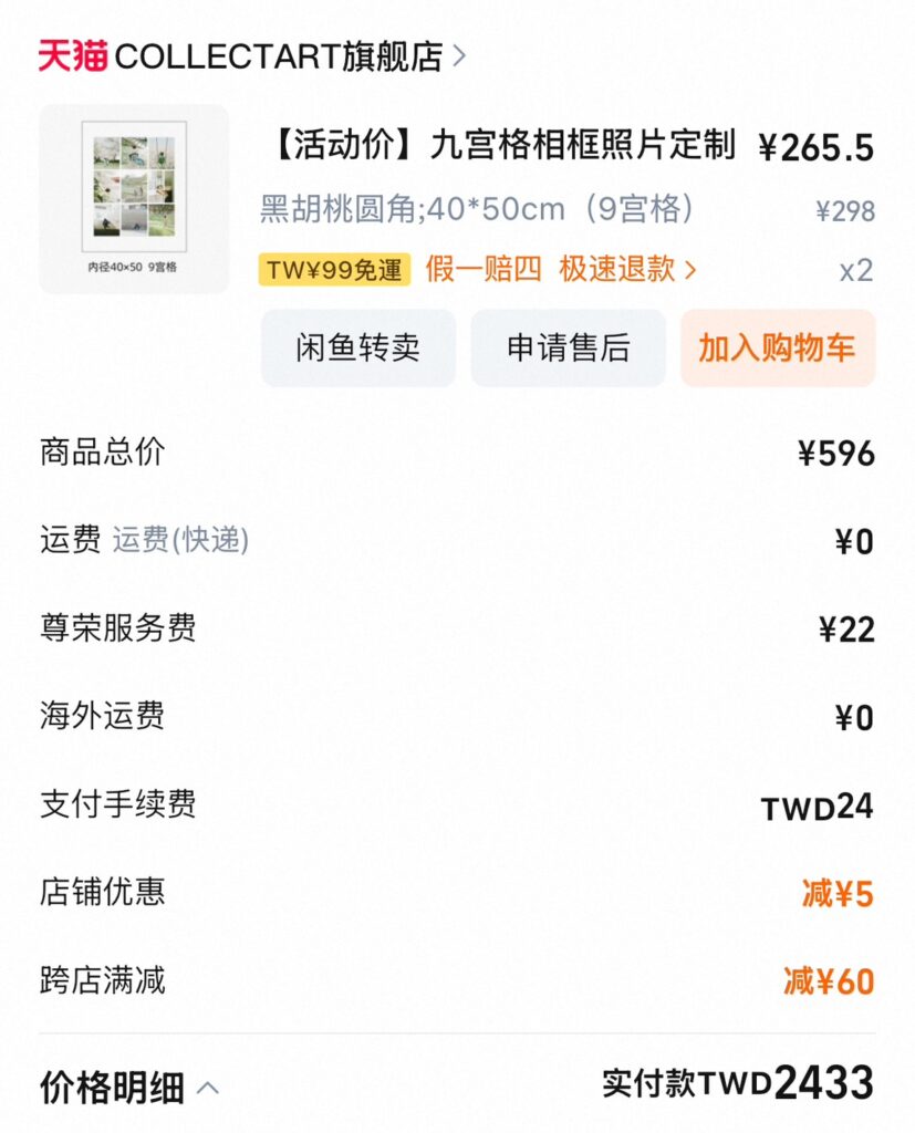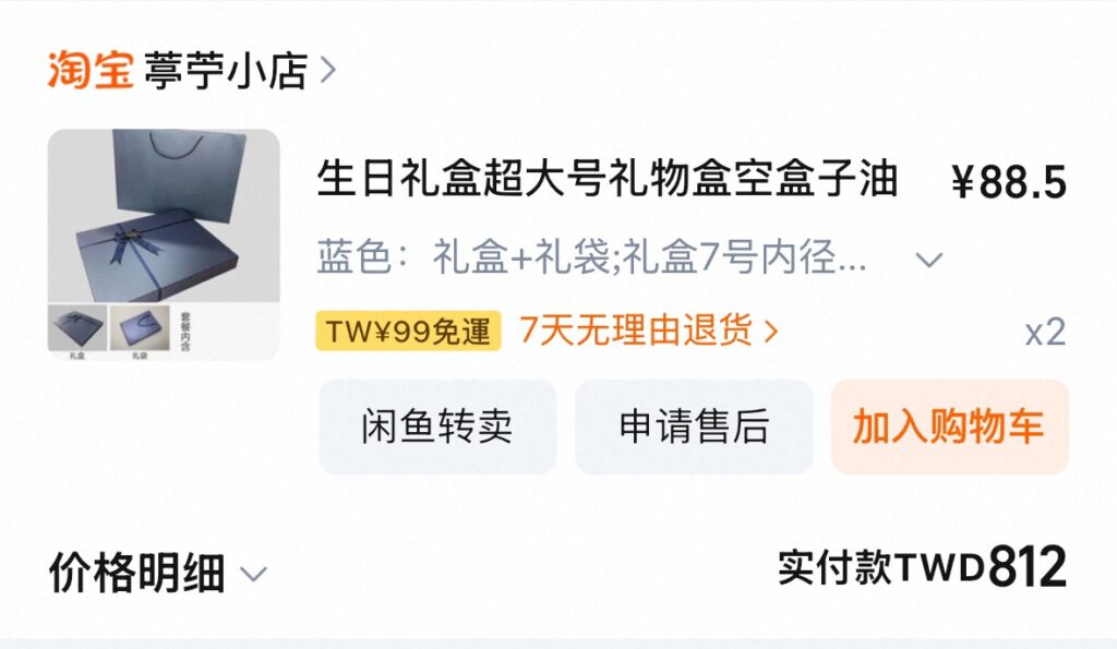 購買明細,1禮盒+1紙袋是401元(含運費關稅)。