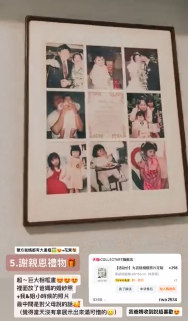 除了花束,我們婚禮上的主要謝親恩禮物,是一份我自己非常滿意的選擇——相框掛畫。裡面放上了爸媽當年的婚紗照、我和姐姐小時候的照片,中間則寫上我們對父母的感謝話語。我們雙方父母收到都超喜歡,覺得非常有意義,也直接把它掛在牆上。