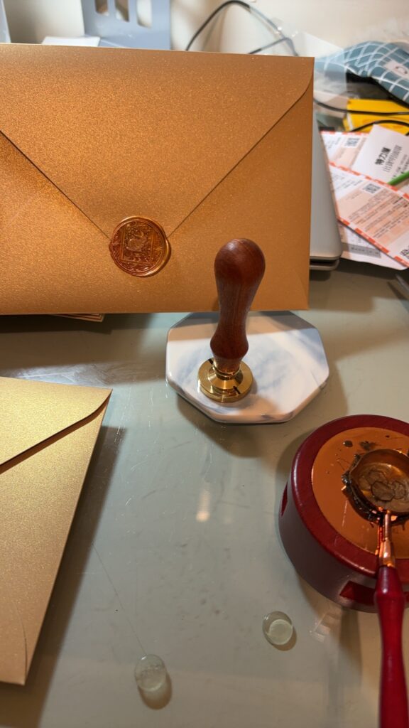 完成喜帖內容後,接著就是信封製作。因為喜帖的尺寸不是一般常見規格,所以需要客製。爸爸讓我們自由挑選信封顏色與材質,我最後選了和喜帖色系相近、閃閃發亮的香檳色。每個信封我都親手蓋上火漆章,雖然很花時間,但完成後的成就感真的無法言喻!