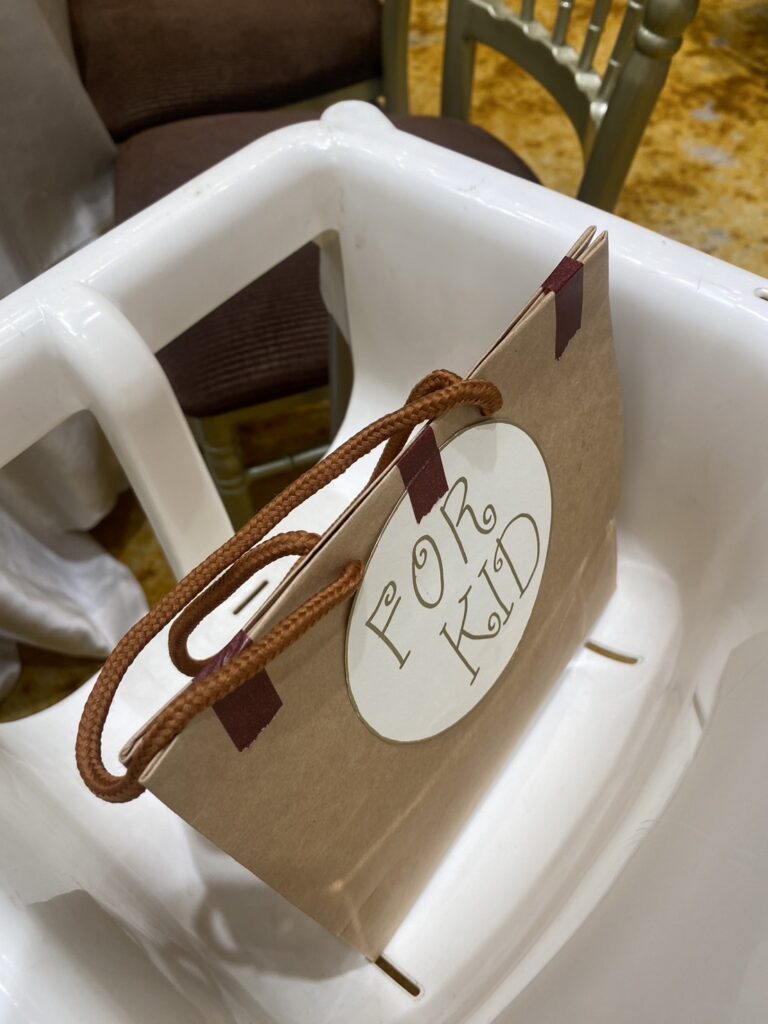 在婚禮宴客酒席上,我也特別準備了兒童小禮物。在網路上買好玩具後,不同年齡,預備不同的禮物,再自己包裝+親手繪製吊牌。前一天拿到會場,請婚企幫我放在每個兒童椅上。不同年齡,預備不同的禮物。